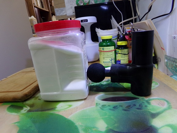 In the photo: On the left, a plastic jar with two kilograms of sugar. On the right is a therapeutic physiotherapy electric massager with four different vibration frequency ranges. The walls of the jar are FLEXIBLE.