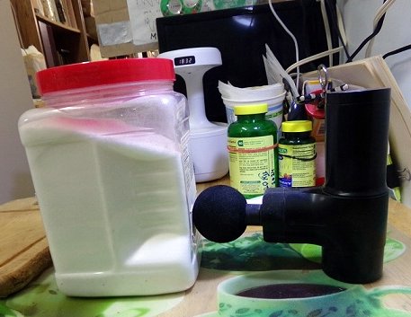 Вторая: Включить электромассажёр и его вибрирующую головку (шарик на фотографии) прижать с умеренной силой к гибкой упругой стенке банки. Тогда вибрации разрушат комья сахара.