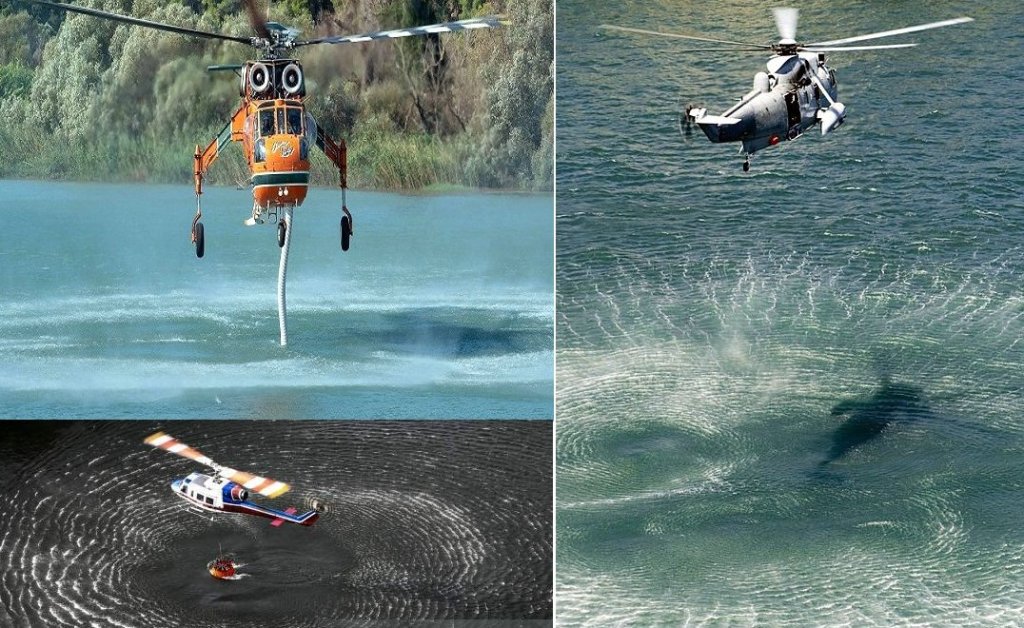 In the photos: Helicopters are hanging above the water, collecting water into an overhead tank or through a pipe into a reservoir inside the hull.